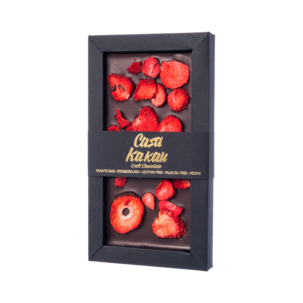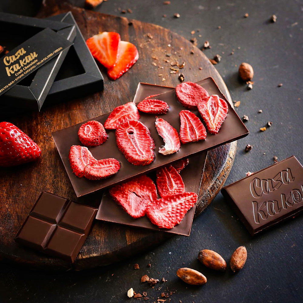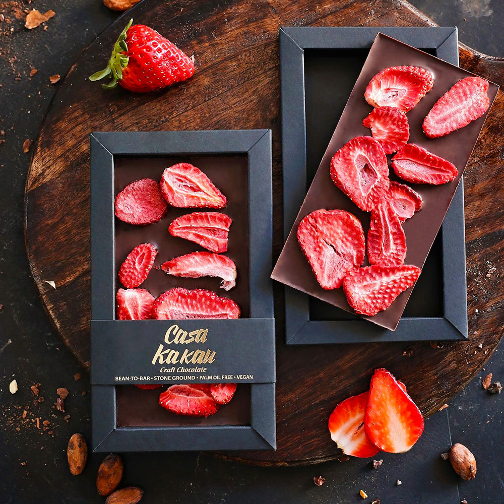 Специална селекция на какаови зърна от най-добрите ферми в Южна Америка. Нашето луксозно предложение за ценителите на качествения шоколад. Подбираме ягодите още при брането и ги изсушаваме чрез щадяща технология, която запазва цвета, формата и 97% от полезните им свойства. Благодарение на това вие може да се наслаждавате на перфектен шоколад и ароматни ягоди в една изискана и свежа комбинация.