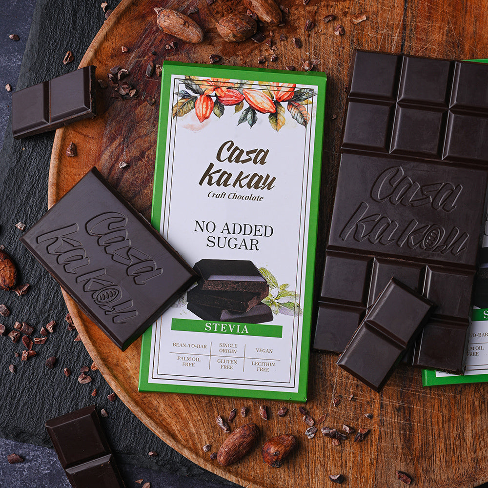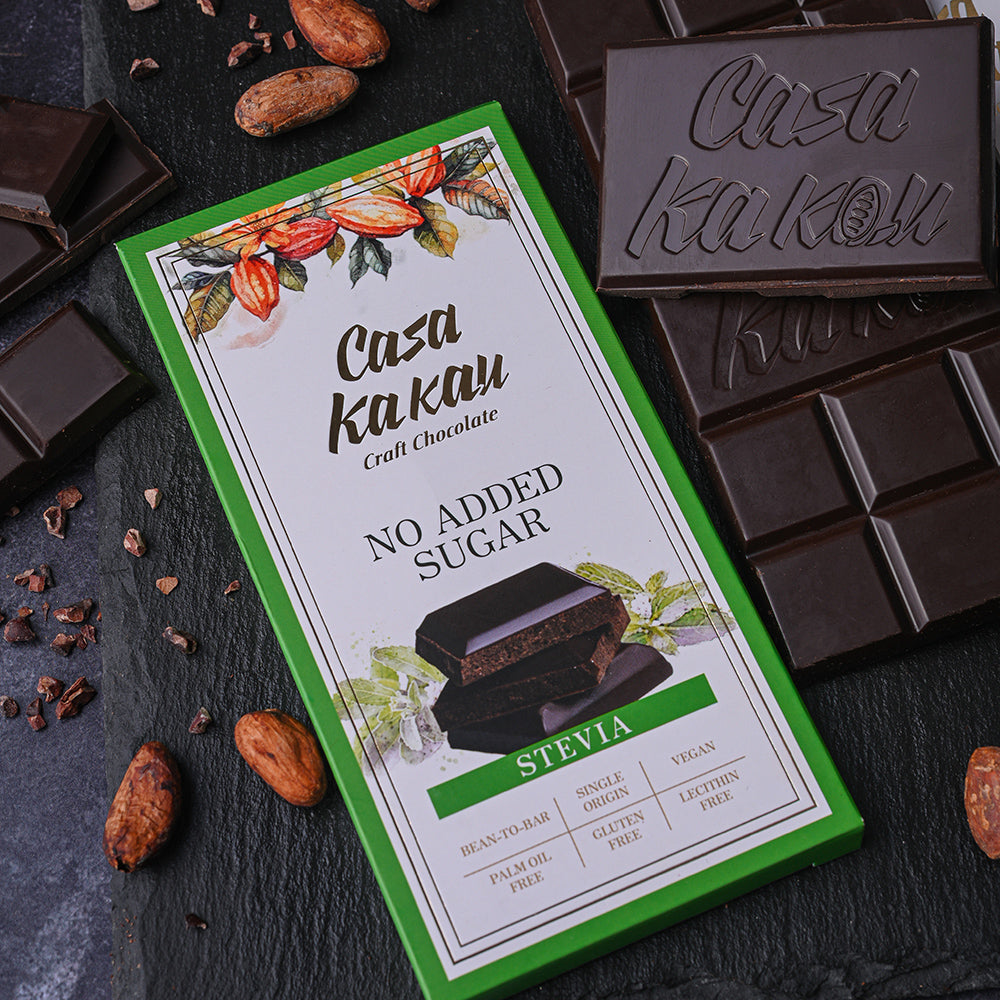 Dark & Stevia е ръчен шоколад, приготвен в каменна мелница по традиционна рецепта от специално подбрани какаови зърна, подсладен с екстракт от стевия. Стевия е растение с доказано положително действие върху организма. Фактът, че листата му са стотици пъти по-сладки от захарта го превръщат в популярен естествен подсладител, който от векове се ползва в различни ястия и напитки в Централна и Южна Америка.
